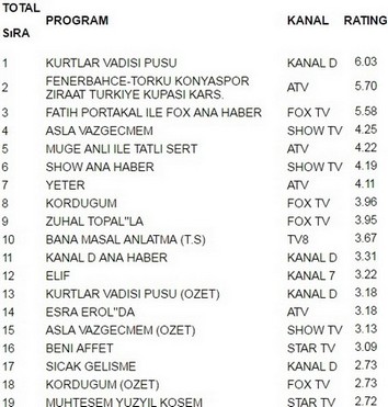 Kanal D ekranlarında yayınlanan Kurtlar Vadisi Pusu 6.03 reytingle 5 Mayıs Perşembe günü en çok izlenen programı oldu. Kurtlar Vadisi Pusu büyük bir başarıya imza atarak Fenerbahçe-Torku Konyaspor Ziraat Türkiye Kupası Karşılaşması’nı geride bıraktı. Fenerbahçe-Torku Konyaspor Ziraat Türkiye Kupası 5.70 reytingle ancak 2. olabildi. İlginçtir ki reytinglerde 3.lüğe ise 5.58 reytingle Fatih Portakal İle Fox Ana Haber yerleşti.