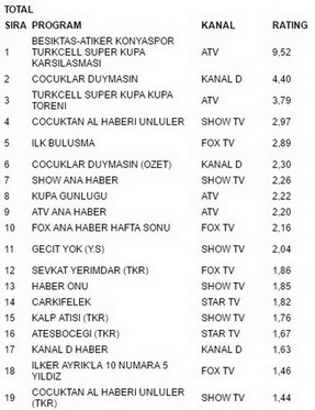 Atv ekranlarında yayınlanan Beşiktaş – Atiker Konyaspor Süper Kupa Karşılaşması 9.52 reytingle 6 ağustos pazar günü en çok izlenen program oldu. Beşiktaş – Atiker Konyaspor karşılaşması büyük bir başarıya imza atarak kanal d ekranlarında yayınlanan Çocuklar Duymasın’ı geçmeyi başardı. Çocuklar Duymasın 4.40 reyting oranıyla 2. olurken. İlginçtir ki reytinglerde 3.lüğe ise 3.79 reytingle Türkcell Süper Kupa Töreni yerleşti.