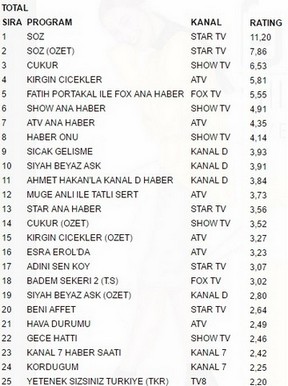 Star tv ekranlarında yayınlanan Söz dizisi 6 kasım pazartesi günü aldığı 11.20 reytingle en çok izlenen program oldu.Söz büyük bir başarıya imza atarak show tv ekranlarında yayınlanan Çukur’u geçmeyi başardı.Söz Özet 7.86 reyting oranıyla 2. olurken. İlginçtir ki reytinglerde 3.lüğe ise 6.53 reytingle Çukur yerleşti