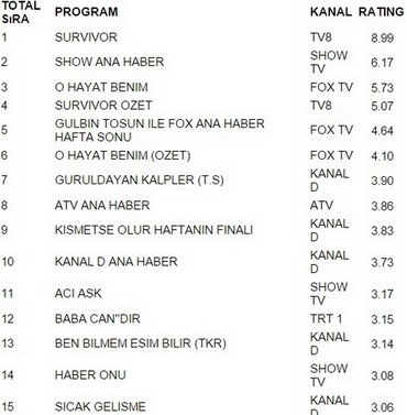 Kanal D ekranlarının en sevilen dizisi Survivor 8.99 reytingle 6 Mart Pazar gününün en çok izlenen programı oldu.Survivor büyük bir başarıya imza atarak Show Ana Haber’i geride bıraktı. Show Ana Haber 6.17 reytingle ancak 2. olabildi. İlginçtir ki reytinglerde 3.lüğe ise 5.73 reytingle O Hayat Benim yerleşti.