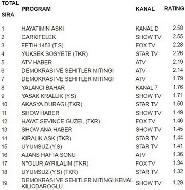Kanal D ekranlarında yayınlanan Hayatımın Aşkı 2.58 reytingle 7 ağustos pazar günü en çok izlenen programı oldu. Güldüy Güldüy Show büyük bir başarıya imza atarak Çarkıfelek’i geride bıraktı. Çarkıfelek 2.55 reytingle ancak 2. olabildi. İlginçtir ki reytinglerde 3.lüğe ise 2.28reytingle Fetih 1453 yerleşti.