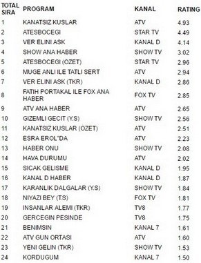 Atv ekranlarında yayınlanan Kanatsız Kuşlar 4.93 reytingle 7 eylül perşembe günü en çok izlenen program oldu.Kanatsız Kuşlar büyük bir başarıya imza atarak atv ekranlarında yayınlanan Ateşböceği’ni geçmeyi başardı. Ateşböceği 4.49 reyting oranıyla 2. olurken. İlginçtir ki reytinglerde 3.lüğe ise 4.14 reytingle Ver Elini Aşk yerleşti.