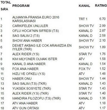 Trt 1 ekranlarında yayınlanan Almanya-Fransa Euro 2016 Karşılaşması 6.70 reytingle 7 temmuz perşembe günü en çok izlenen programı oldu. Almanya-Fransa Euro 2016 Karşılaşması büyük bir başarıya imza atarak Çarkıfelek Ünlüler’i geride bıraktı. Çarkıfelek Ünlüler 2.99 reytingle ancak 2. olabildi. İlginçtir ki reytinglerde 3.lüğe ise 2.87 reytingle Oflu Hoca’nın Şifresi yerleşti.
