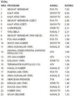 Fox Tv ekranlarında yayınlanan Şevkat Yerimdar 7.02 reytingle 7 temmuz cuma günü en çok izlenen program oldu. Şevkat Yerimdar büyük bir başarıya imza atarak show tv ekranlarında yayınlanan Kalp Atışı geçmeyi başardı. Kalp Atışı 6.04 reyting oranıyla 2. olurken. İlginçtir ki reytinglerde 3.lüğe ise 4.03 reytingle Kalp Atışı (TKR) yerleşti.