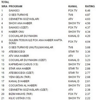 Fox tv ekranlarında yayınlanan Savaşçı dizisi 8 ekim pazar günü aldığı 6.46 reytingle en çok izlenen program oldu. Savaşçı büyük bir başarıya imza atarak Tv8 ekranlarında yayınlanan O Ses Türkiye’yi geçmeyi başardı. O Ses Türkiye 4.87 reyting oranıyla 2. olurken. İlginçtir ki reytinglerde 3.lüğe ise 4.63 reytingle Cennetin Gözyaşları yerleşti.