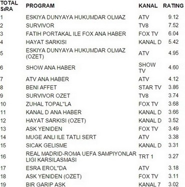Atv ekranlarının en sevilen dizisi Eşkiya Dünyaya Hükümdar Olmaz 9.12 reytingle 8 Mart Salı gününün en çok izlenen programı oldu. Kırgın Çiçekler büyük bir başarıya imza atarak Survivor’ı geride bıraktı. Survivor 7.52 reytingle ancak 2. olabildi. İlginçtir ki reytinglerde 3.lüğe ise 6.04 reytingle Fatih Portakal İle Fox Ana Haber yerleşti.