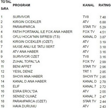 Tv8 ekranlarında yayınlanan Survivor 7.48 reytingle 9 Mayıs pazartesi günü en çok izlenen programı oldu. Survivor büyük bir başarıya imza atarak Kırgın Çiçekler’i geride bıraktı. Kırgın Çiçekler 6.88 reytingle ancak 2. olabildi. İlginçtir ki reytinglerde 3.lüğe ise 5.29 reytingle Paramparça yerleşti.