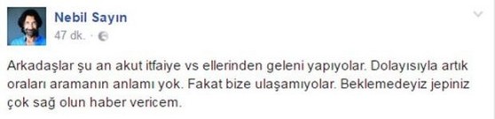 Sevilen oyuncu Sayın son durumu şu şekilde belirtti; Arkdaşlar şuan AKUT, itfaiye vs ellerinden geleni yapıyorlar. Dolayısıyla artık onları aramanın anlamı yok. Fakat bize ulaşamıyorlar. Beklemedeyiz, haber vereceğim, sözlerini ekledi.Kurtarma ekibi Akut İçerde ekibiyle irtibatta olduğunu sosyal medya hesabından duyurdu.